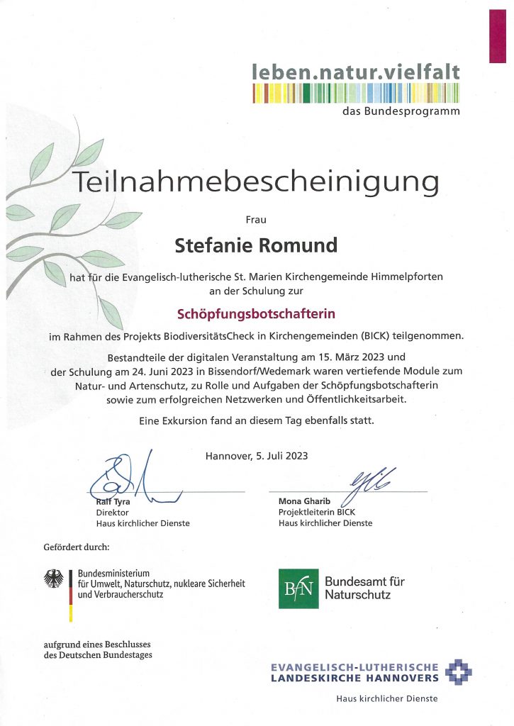 Ihre Ansprechpartnerin: Stefanie Romund, Schöpfungsbotschafterin der Ev.-luth. St. Marien Kirchengemeinde Himmelpforten und Beauftragte für Artenvielfalt
